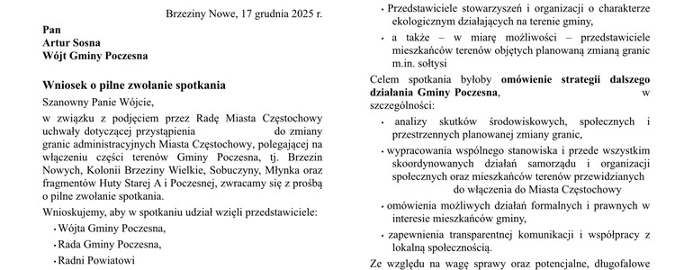 15 grudnia 2025 roku Stowarzyszenie EKO Poczesna skierowało do Rady Miasta Częstochowy oficjalne wezwanie do uchylenia w całości uchwały z dnia 4 grudnia 2025 r. dotyczącej przystąpienia do procedury zmiany granic administracyjnych miasta.