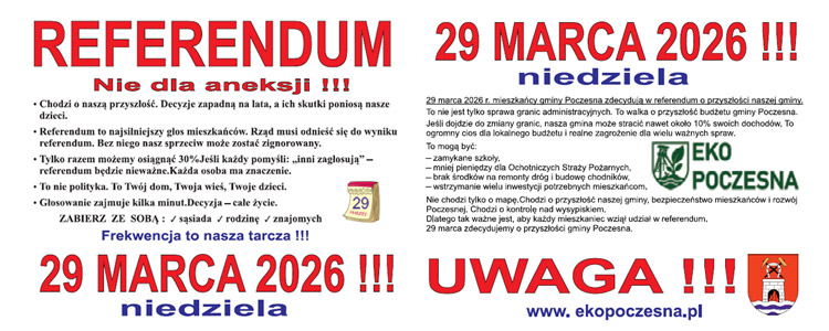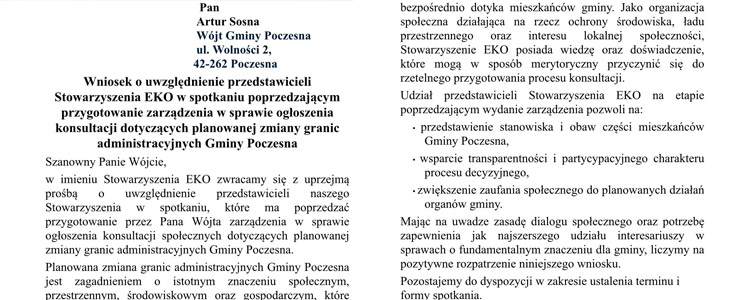 Zobacz wideo →29 grudnia 2025 roku Stowarzyszenie EKO Poczesna skierowało do Wójta Artura Sosny pismo z prośbą o uwzględnienie przedstawicieli stowarzyszenia w spotkaniu poprzedzającym przygotowanie zarządzenia dotyczącego ogłoszenia konsultacji w sprawie planowanej zmiany granic administracyjnych Gminy Poczesna.