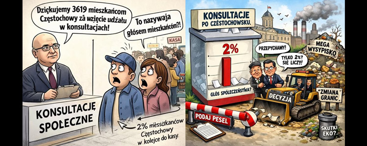 17 lutego 2026 roku Nie zazdrościmy, komentujemy. Porażka konsultacji społecznych zorganizowanych przez Urząd Miasta Częstochowy wśród mieszkańców miasta. Zalednie 2% frekwencji!!! Zrozumiałe, że w większości głosowali mieszkańcy, którzy byli "ZA", czyli pracownicy urzędów i spółek miejscich wraz z rodzinami ...i to chyba nie wszyscy.