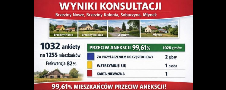 Czytaj więcej →19 lutego 2026 roku Złożono 1032 ankiety na 1255 mieszkańców, co stanowi 82% frekwencji (dane gminy). Tylko dwie osoby zagłosowały "ZA" przyłączeniem naszych miejscowości do Częstochowy. Jedna osoba wstrzymała się od głosu a 1 karta była nieważna. Wynika więc, że 99,61% mieszkańców jest "PRZECIW" anektowaniu naszych ziem, domów i nas samych do miasta Częstochowy. To wyraz naszej spójności!!!